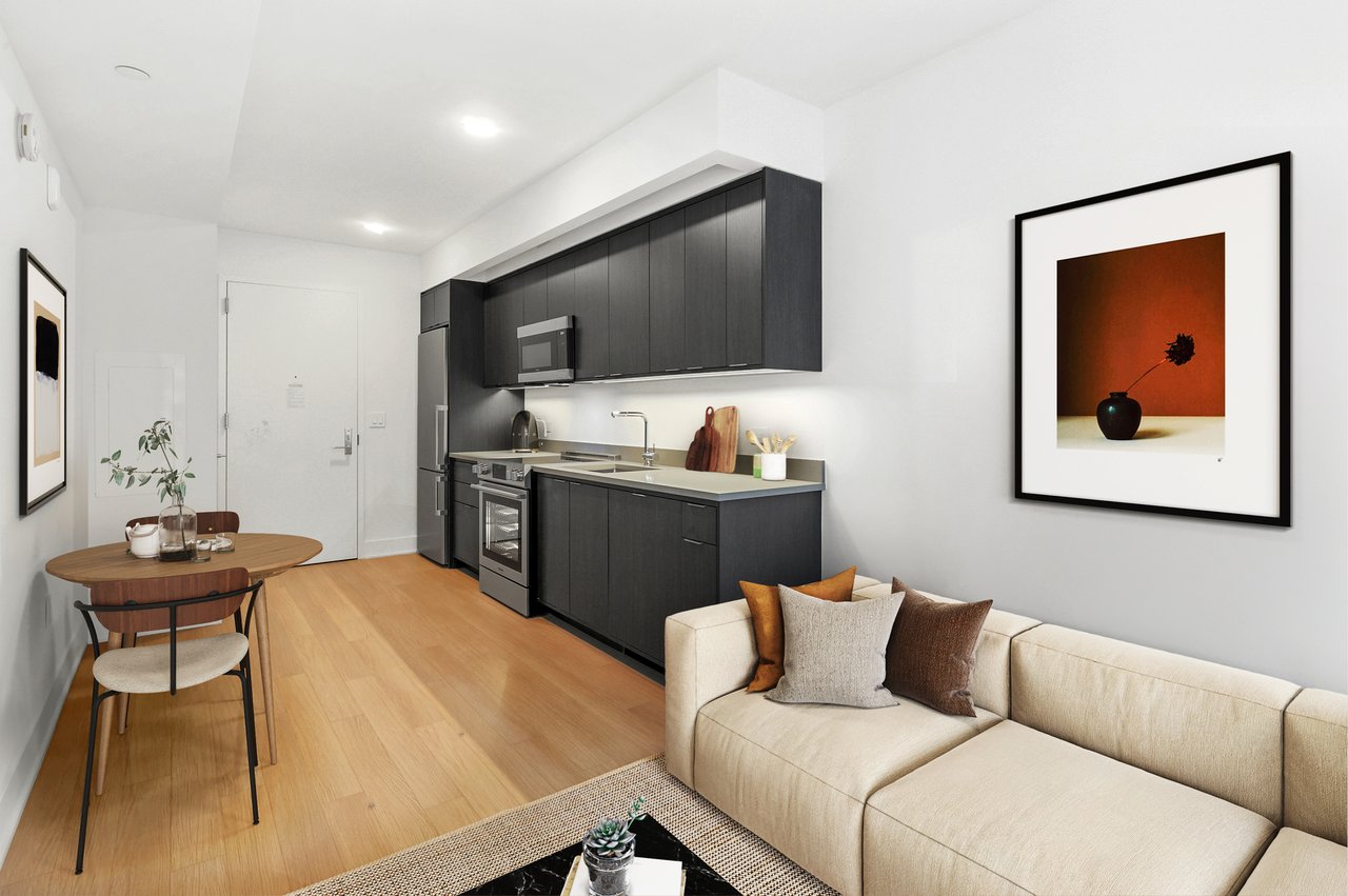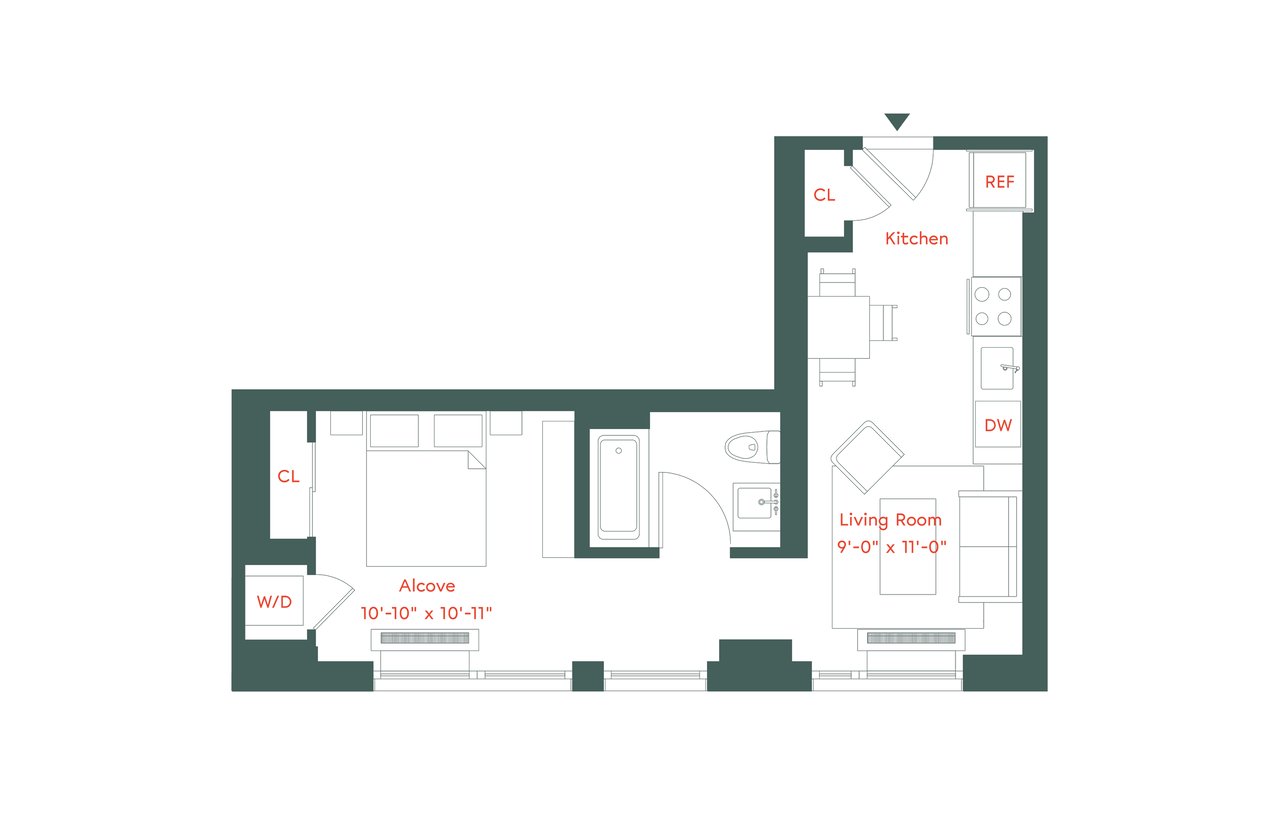Available for April move in. Thoughtfully designed junior 1 bedroom home with windows lining the west side of the apartment, allowing natural light throughout.